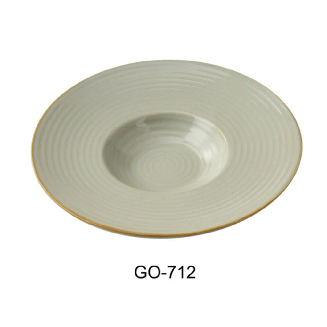 The EcoQuality Dessert Plate is a commercial-grade porcelain plate designed for durability and aesthetic appeal in foodservice settings. Measuring 12 inches in diameter by 5.87 inches wide by 2 inches in height and capable of holding up to 10 ounces, this plate features a wide rim and curved edge, making it suitable for serving desserts and small appetizers. Its earthy tone complemented by a golden rim offers a refined presentation for upscale cafes, restaurants, and catering environments. Constructed from high-quality porcelain, the plate is microwave and dishwasher safe, supporting efficient cleaning cycles and workstation versatility.