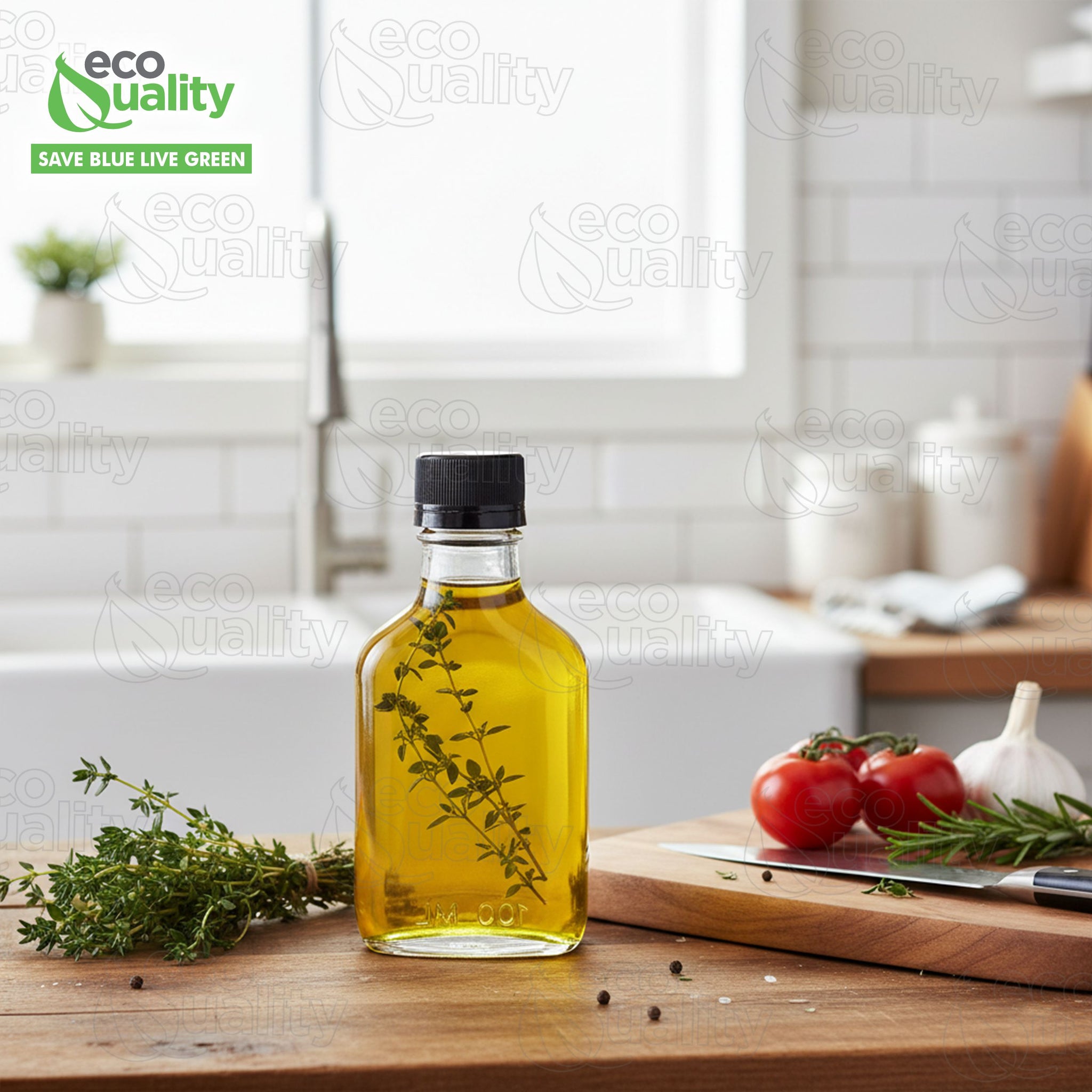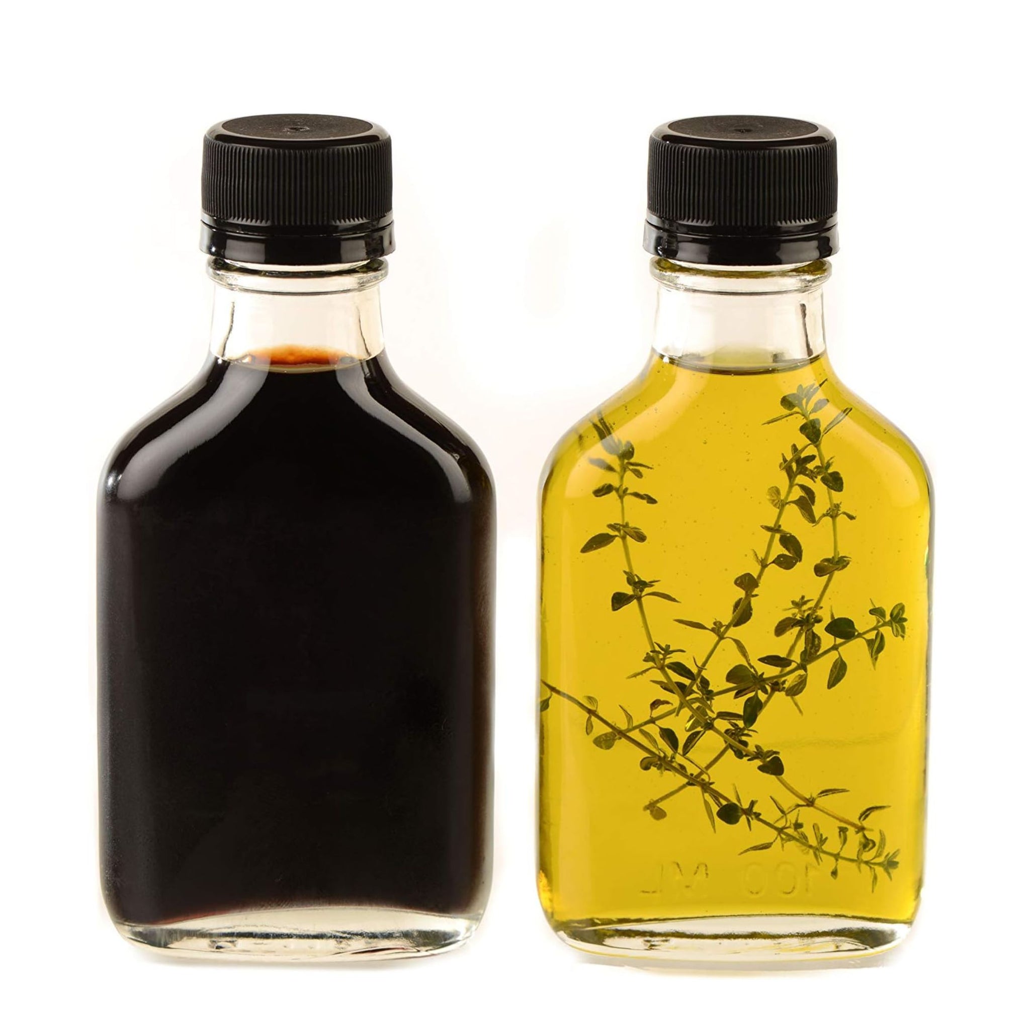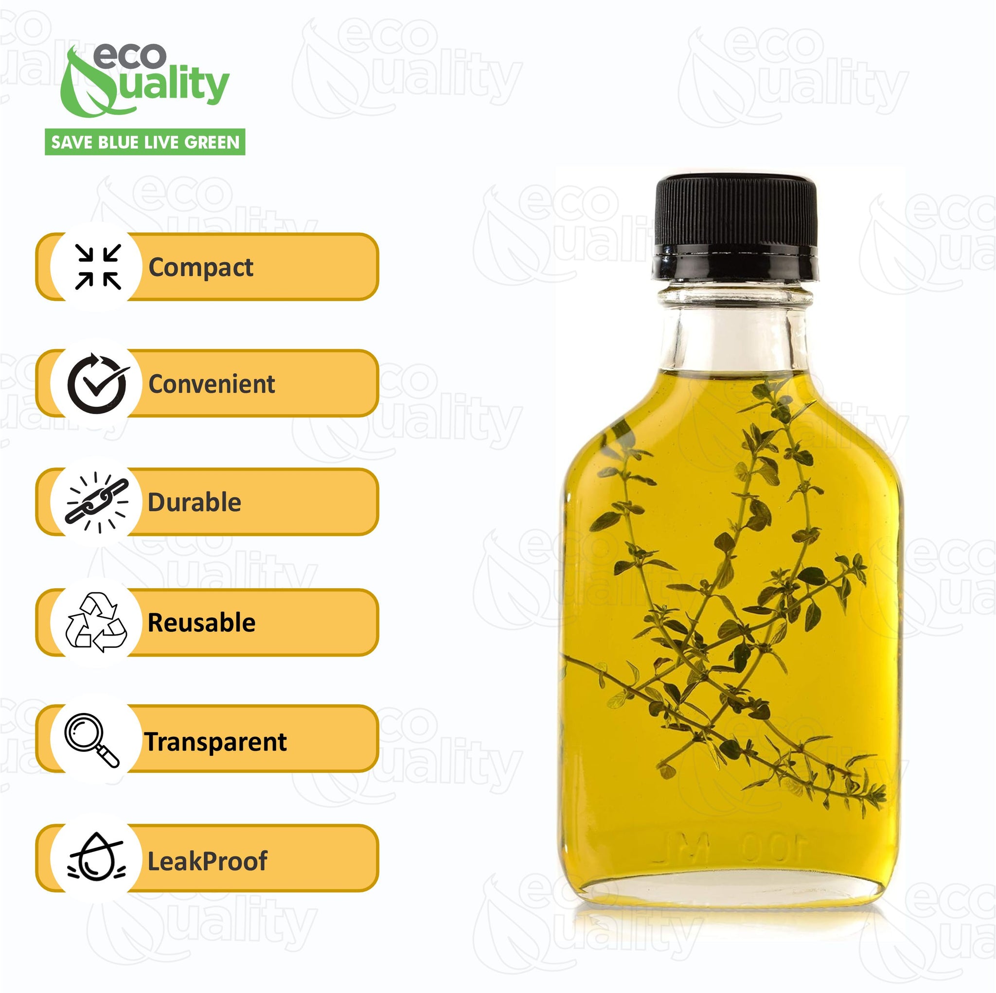 Glass Flask Bottles with Black Temper Evident Lids 100 ML - Glass Flasks for Oil, Liquor, Sauces and To Go Travel Flask
