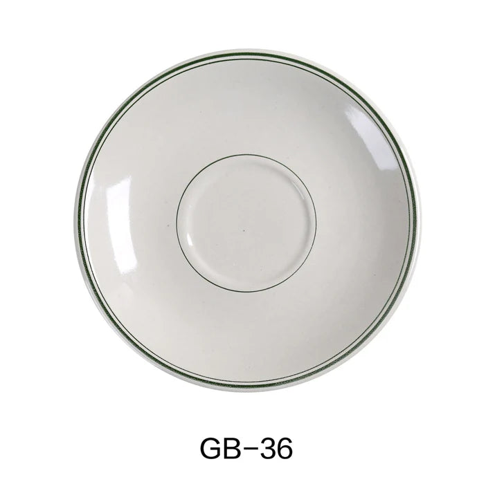 The EcoQuality Saucer offers a classic alternative to traditional American White dinnerware, designed to complement your Green Band cups and bowls. Part of our elegant Green Band collection, this saucer is characterized by its tasteful green striped rim, providing a touch of color and sophistication. Crafted from high-quality porcelain, this saucer is both durable and versatile, making it an excellent addition to any dining setting, protecting surfaces from spills and offering space for small bites. This saucer measures 4.50 inches in diameter suitable for restaurants, cafes and home use. High quality and affordable EcoQuality dinnerware.