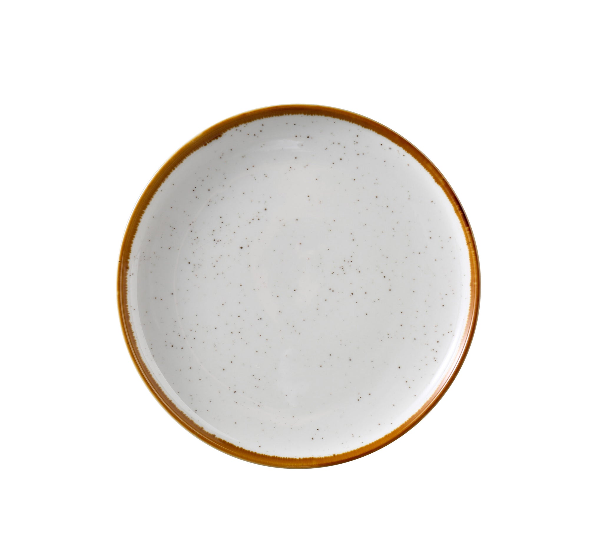 EcoQuality Round Plate With Up-Right Rim brings a modern elegance to tabletop presentations. Crafted from durable porcelain, it showcases a clean white finish with soft speckles and a gently colored rim. Measuring 6.50 inches in diameter by 0.75 inch in height. The up-right edge design not only adds a distinctive touch but also helps contain food, making it ideal for serving bread, butter, or small appetizers with style.