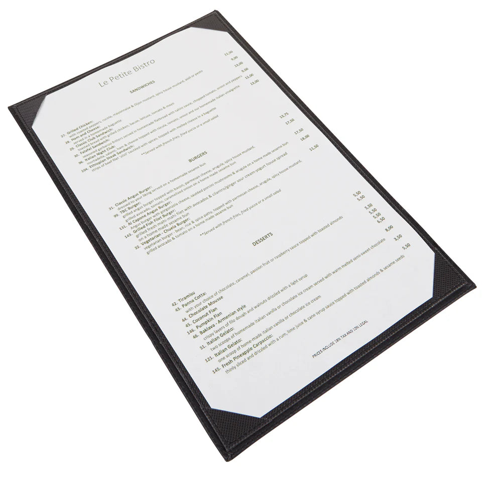• Secure interior picture corners ensure menus stay in place and maintain a professional appearance, even with frequent handling.