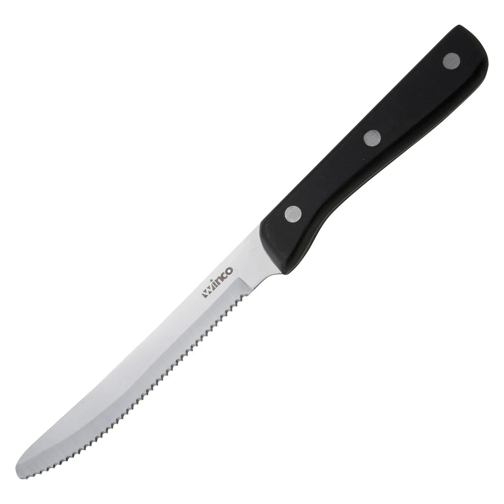 Introducing the Winco K-80P 5" Blade Jumbo Steak Knives, made with precision and durability in mind, these steak knives are a must for complete steak house table settings. Upgrade your steak service with the Winco K-80P 5" Blade Jumbo Steak Knives, combining functionality, durability, and style for an unmatched dining experience. Recommended for use in restaurant kitchens, buffet stations, and catering services.