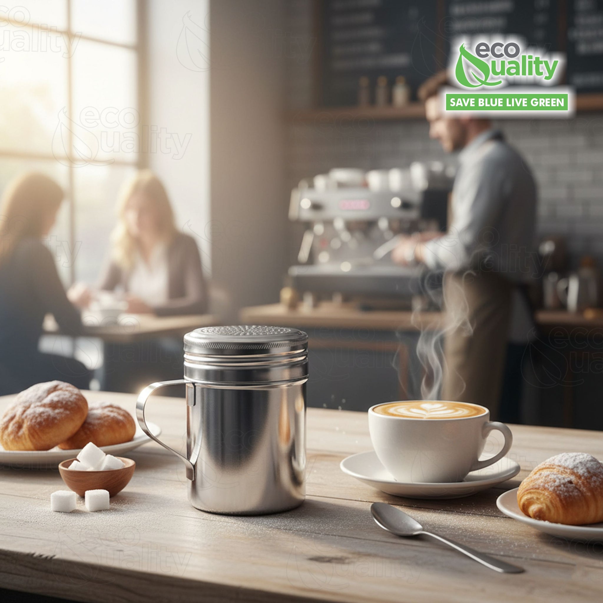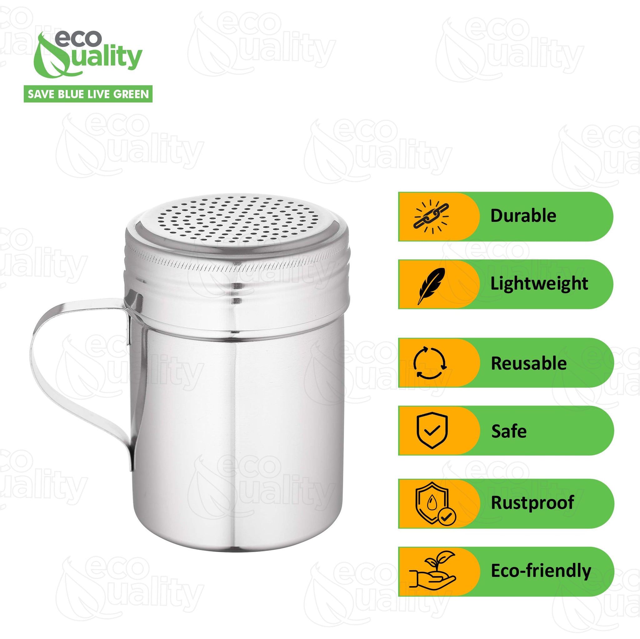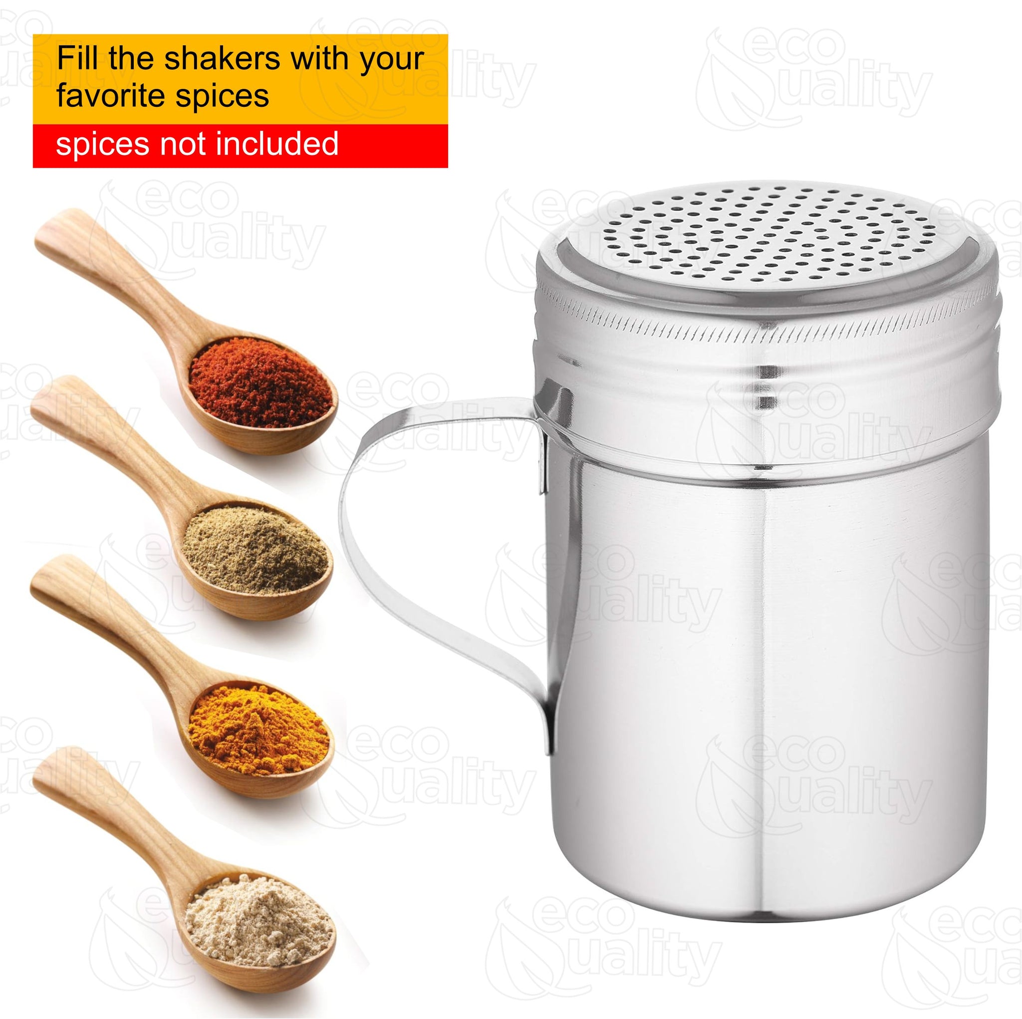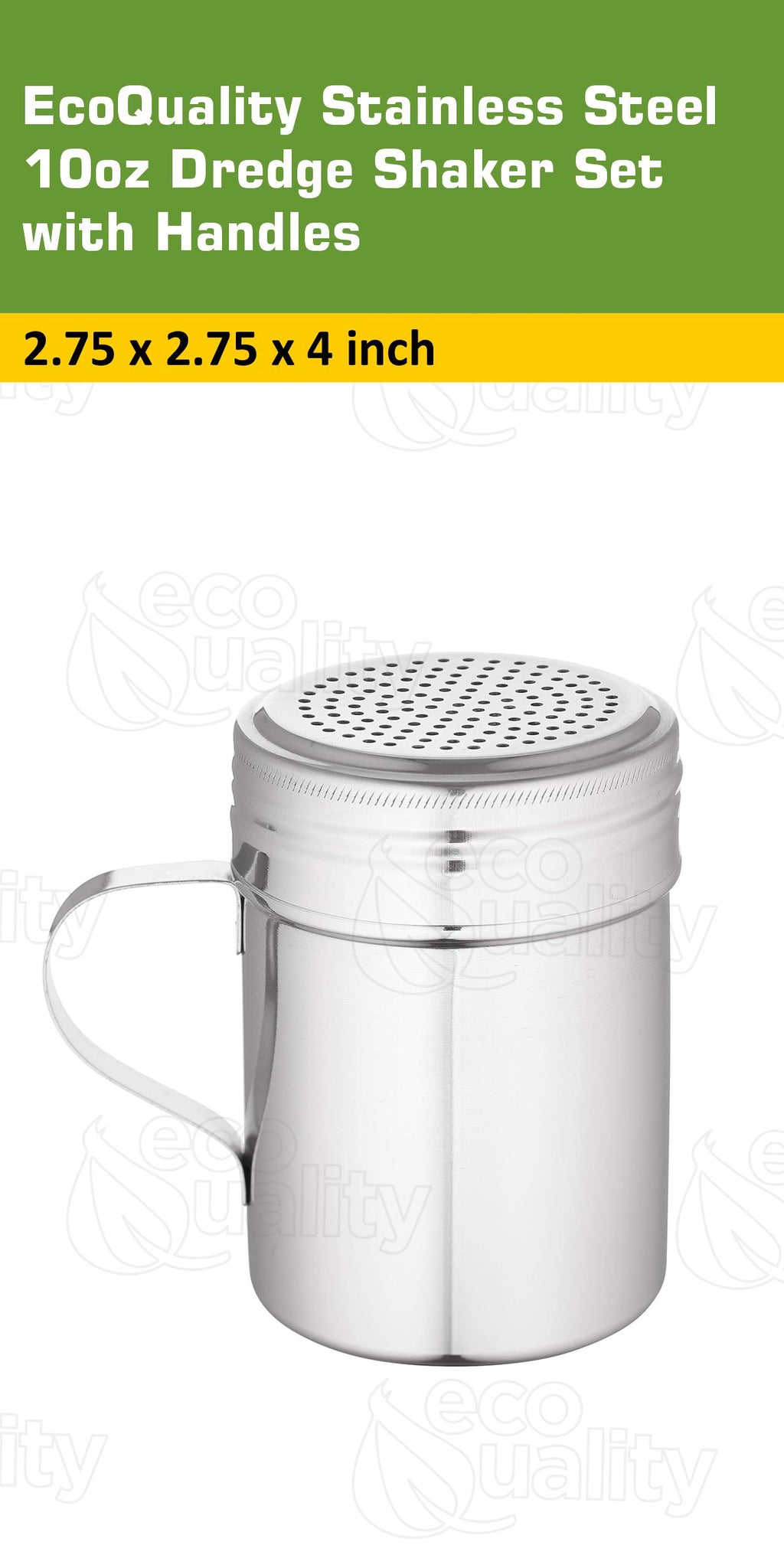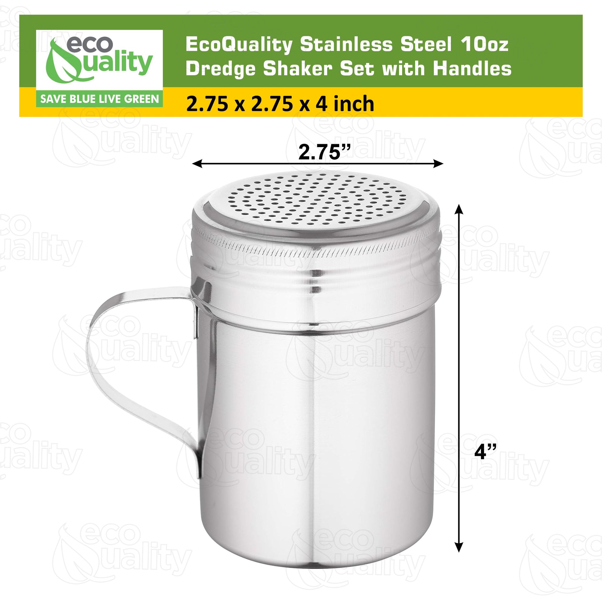 EcoQuality's Stainless Steel Versatile Dredge Shaker Package comes with your selected quantity Stainless Steel Salt & Pepper Dredge with Handles. Big enough to last multiple uses before the need to refill but compact enough to save counter space. Each holds 10 ounces. Safe for dishwasher use, dry it promptly after each wash.