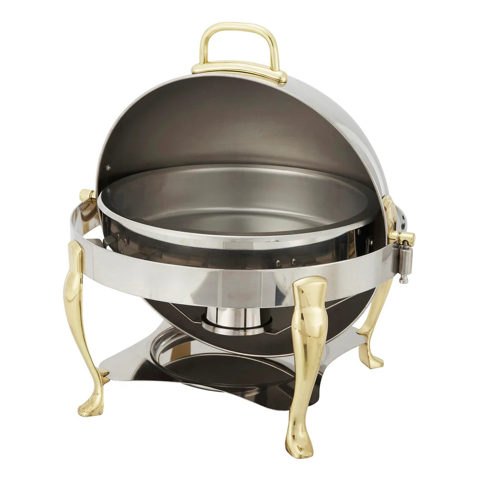 The Winco 308A Vintage 6 Quart Stainless Steel Round Chafer is the vintage collection's height of style. A sophisticated buffet setting would be well complemented by this chafer's mirrored finish, roll-top cover that opens to 90° or 160°, and elegant, curving legs with gold accents. Fitted with a fuel holder(s), meal pan, and water pan, it has a roomy 6-quart capacity. For pros, it's useful because it's simple to assemble, disassemble, and clean. With this elegant and practical fusion, you may elevate the appearance of your meal.