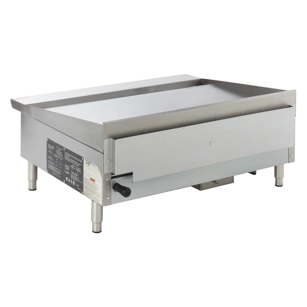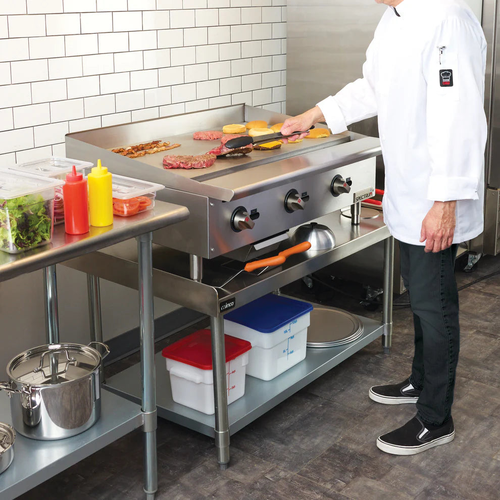 The Winco NGGD-12M-48M Manual Control Natural Gas Griddle is a top-of-the-line commercial-grade cooking appliance, designed to provide powerful, reliable, and precise cooking performance. With its large flat top surface and two independently controlled heat zones, this griddle ensures even cooking across various foods, making it perfect for restaurants, steakhouses, and high-volume kitchens. Featuring high-performance burners, a durable stainless steel cooking surface, and convenient manual control, this griddle is built to handle the rigors of everyday use in a fast-paced culinary environment.