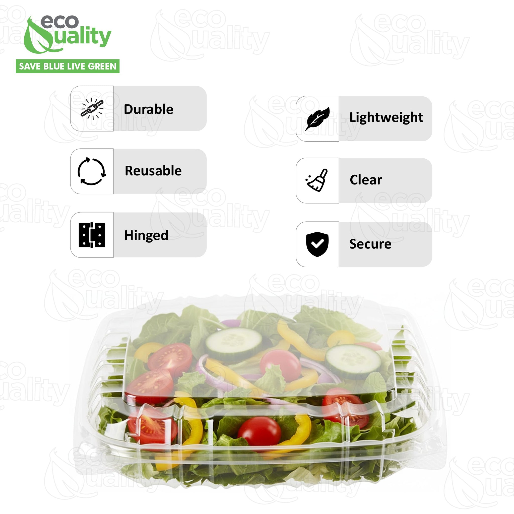 EcoQuality Clear Hinged Lid Clamshell Plastic Containers are great containers for carry out , disposable salad container, plastic cookie container, bakery take out containers , cake slice containers and clear clamshell boxes. Our clamshell containers is what your business , home or restaurant needs!