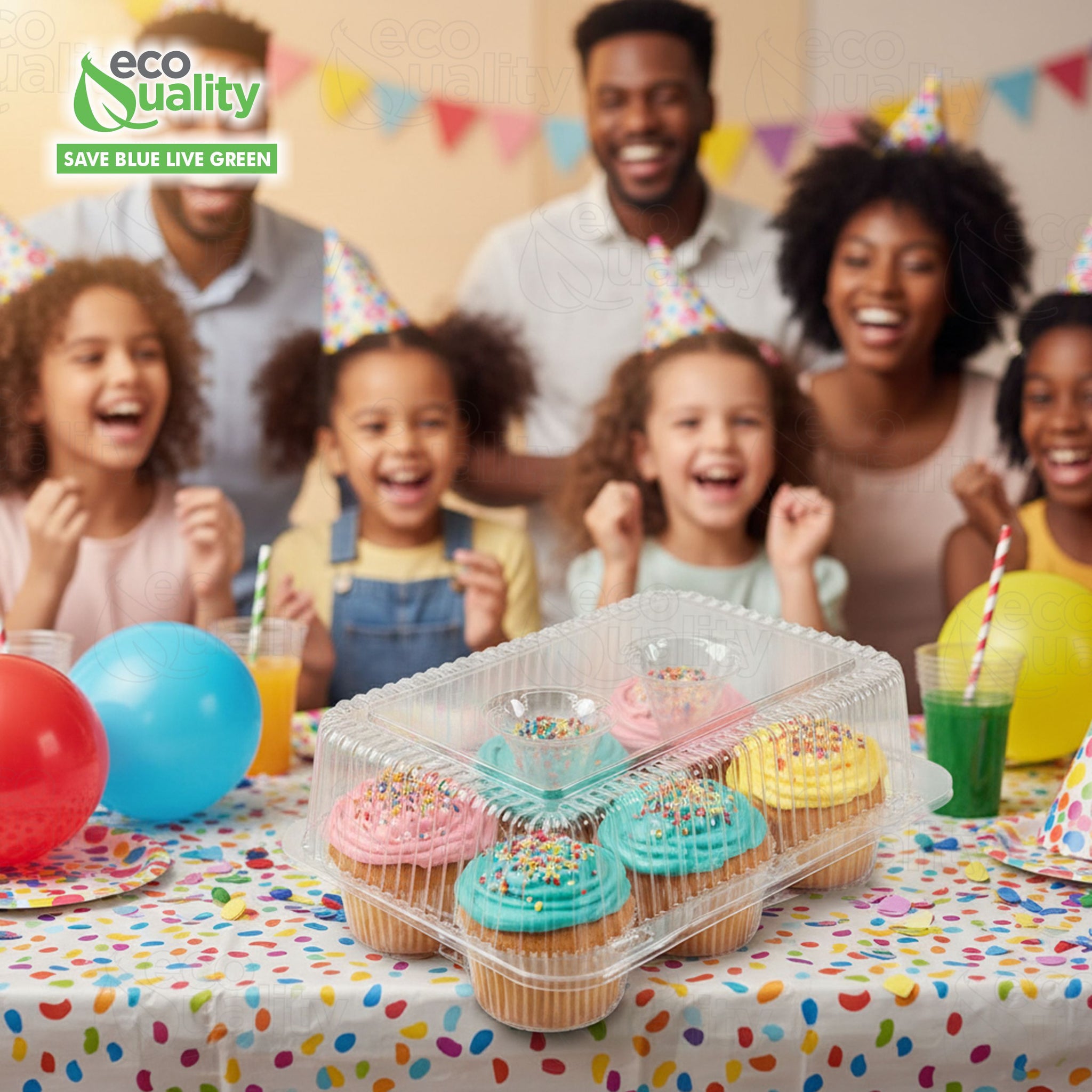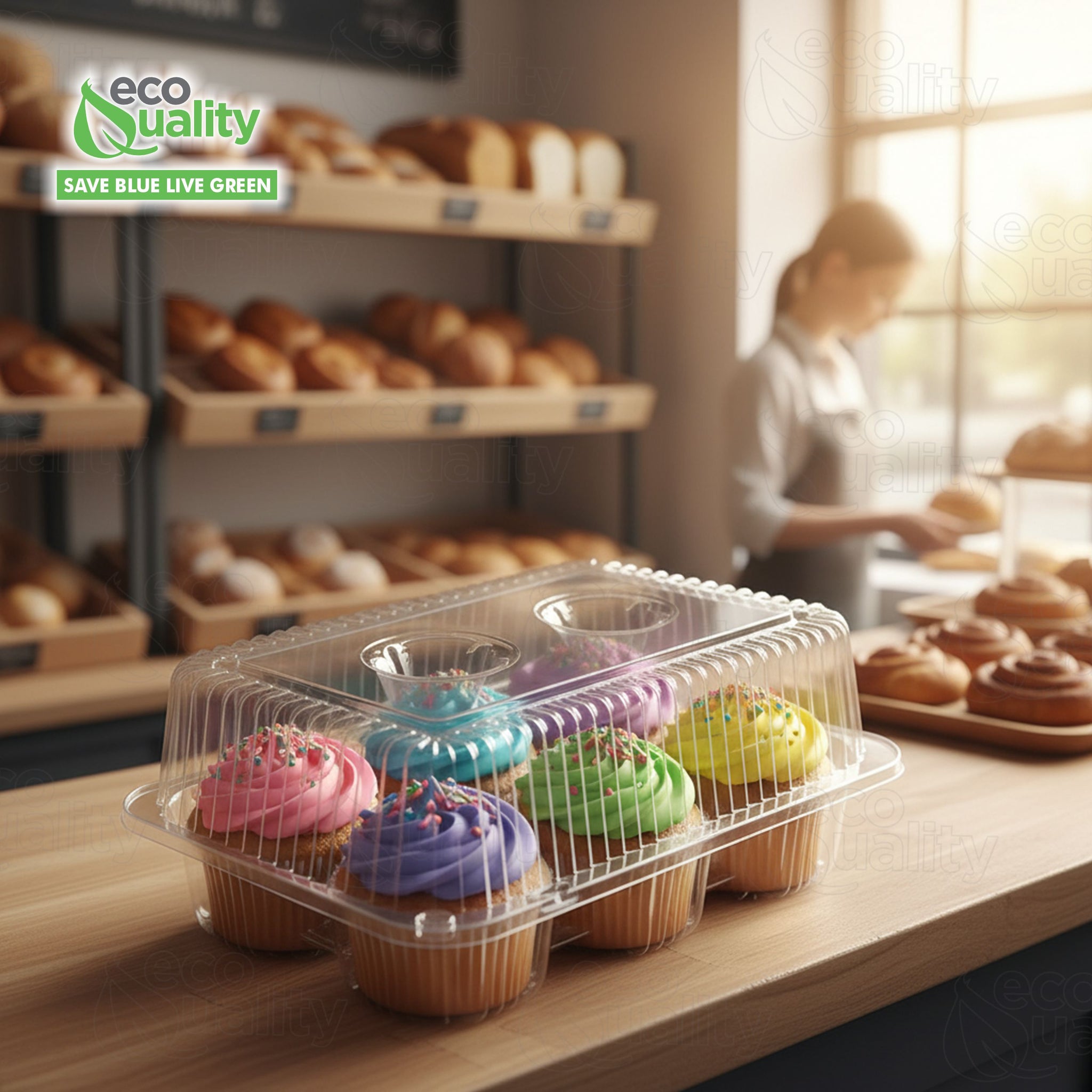EcoQuality 10 Count Clear 6 Compartment cupcake carrier design is great for brunch parties, birthdays, babyshowers and more! This 6 cup high top cupcake container can hold up to six muffins or cupcakes. This containers clear appearance allows you to showcase your baked goods with amazing display!