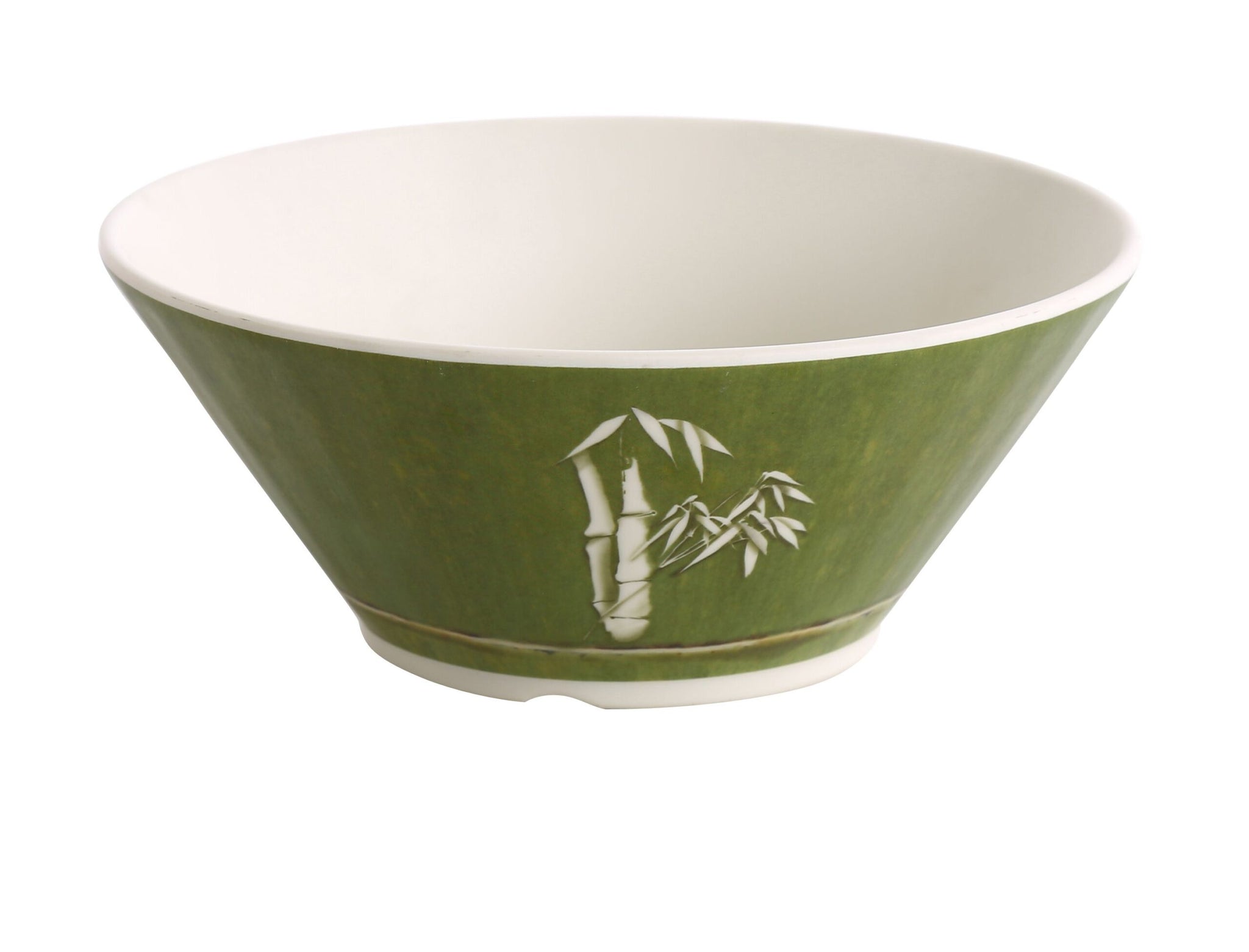 EcoQuality Salad/Noodle Bowl is a great and affordable restaurant tableware. It is made from durable and reliable melamine material, which makes the bowl look like ceramics. You can use these unique round salad bowls to serve such dishes like rice, miso soup, noodles or salads. Thanks to the elegant Bamboo collection style, the bowl will perfectly fit any food-serving establishment design. Performed in stylish green color With natural bamboo look, such melamine tableware is an ideal solution for those who choose high-quality, durable and affordable dinnerware for their place. This bowl measures 8.75 inches in diameter. Such 58 Oz salad bowls are also BPA free and NSF listed, so you can easily use them for both personal and commercial aims. Note that bowls are not microwave safe.