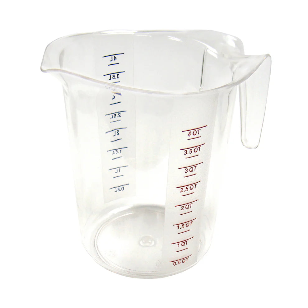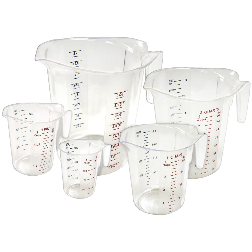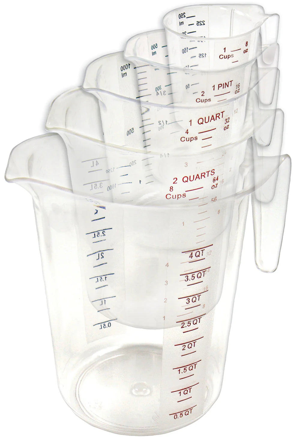 - The measuring cups feature easy-to-read external markings with red lettering for quarts and blue lettering for liters, enhancing visibility and accuracy while measuring.