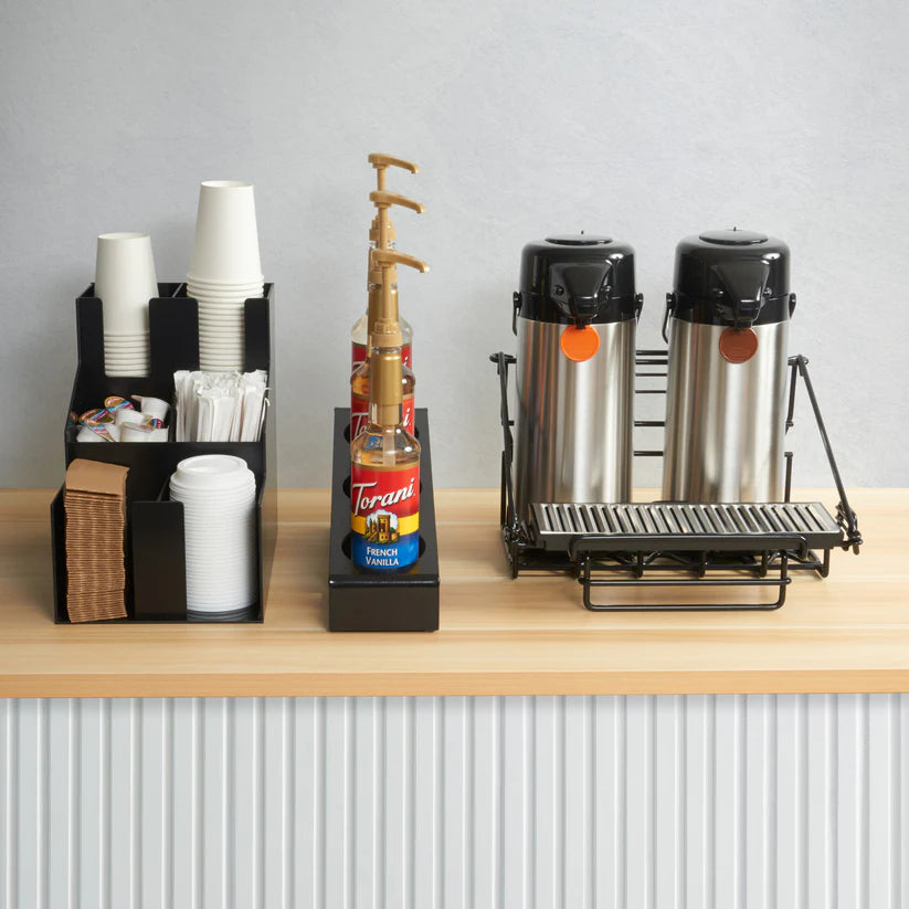 - Keeps syrup and condiment bottles neatly arranged, reducing clutter and maximizing countertop space.