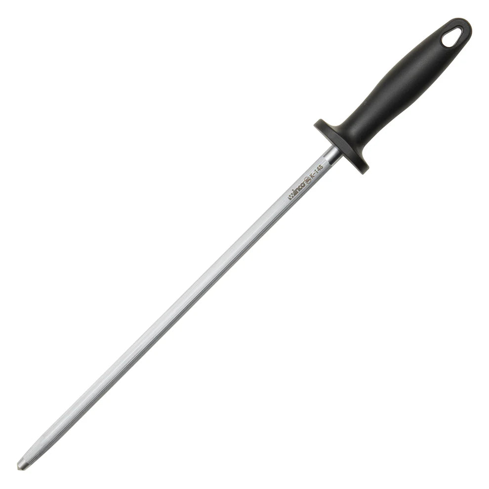 - The 12” or 14” long round rod is crafted from high-quality stainless steel, ensuring durability and long-lasting performance in maintaining a sharp knife blade edge.
