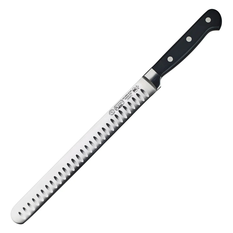 The Winco KFP-102 is a standout in the Acero cutlery collection, offering exceptional performance and precision for both professional chefs and home cooks. This 10" fish and roast slicer is expertly crafted from German steel, and designed to deliver unparalleled sharpness and durability. The knife features a Granton edge, ideal for effortlessly slicing through delicate fish and large roasts, making it a versatile addition to any kitchen.