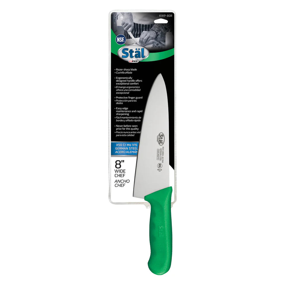The Winco KWP-80 to KWP-80Y series of 8" cook's knives is an essential tool for both professional chefs and home cooks who demand precision, durability, and comfort in their kitchen tools. Crafted with high-quality X50 Cr MoV15 German steel, these knives are designed to tackle a wide range of kitchen tasks with ease. Whether you’re chopping, dicing, or slicing, the razor-sharp blade ensures effortless cuts every time. Available in various colors, these knives not only provide exceptional performance but also allow for easy color-coding to prevent cross-contamination. The ergonomic, slip-resistant polypropylene (PP) handle ensures a secure grip, even during extended use, making it perfect for the fast-paced environment of a commercial kitchen. NSF listed for safety and sanitation, this knife is built to meet the rigorous demands of daily food preparation.