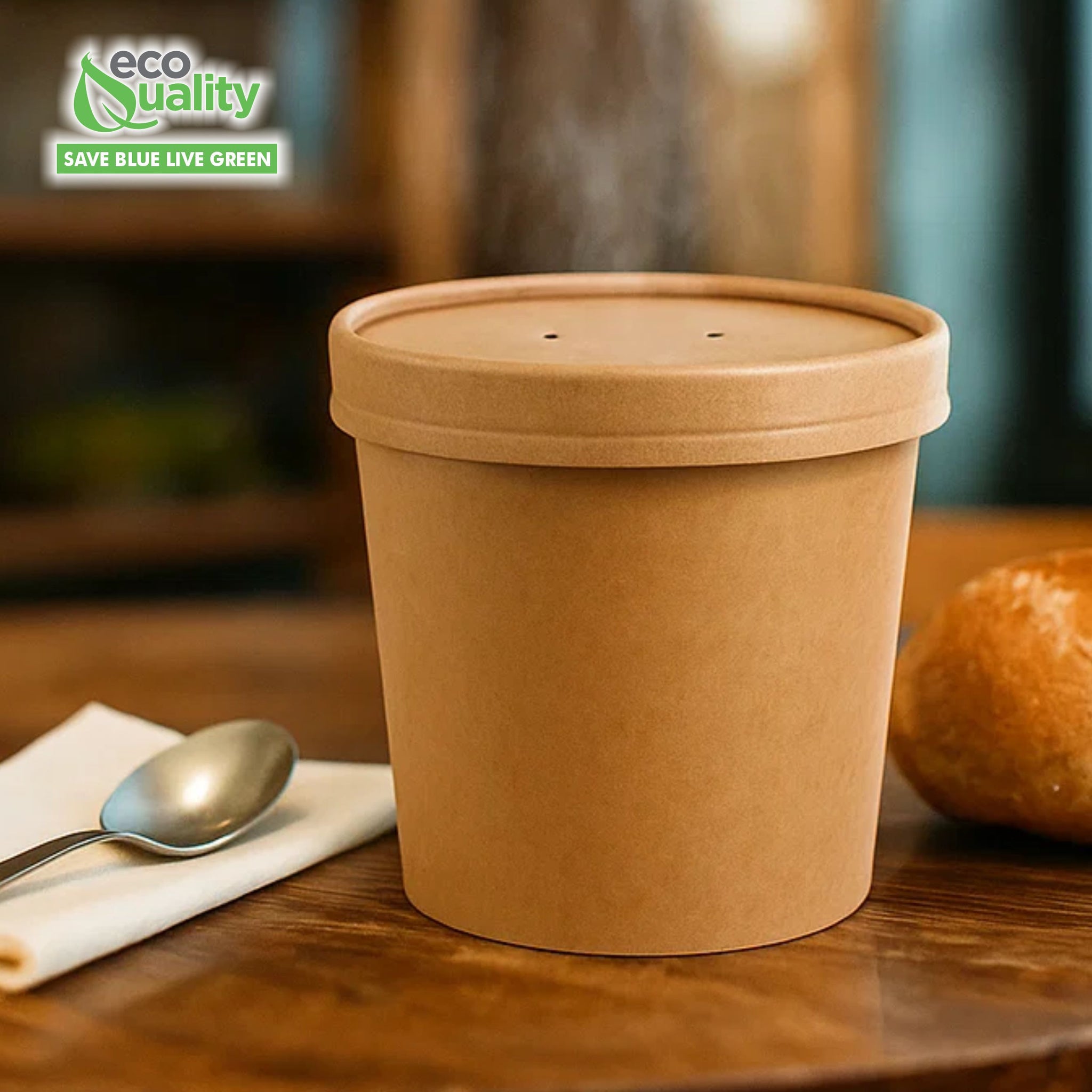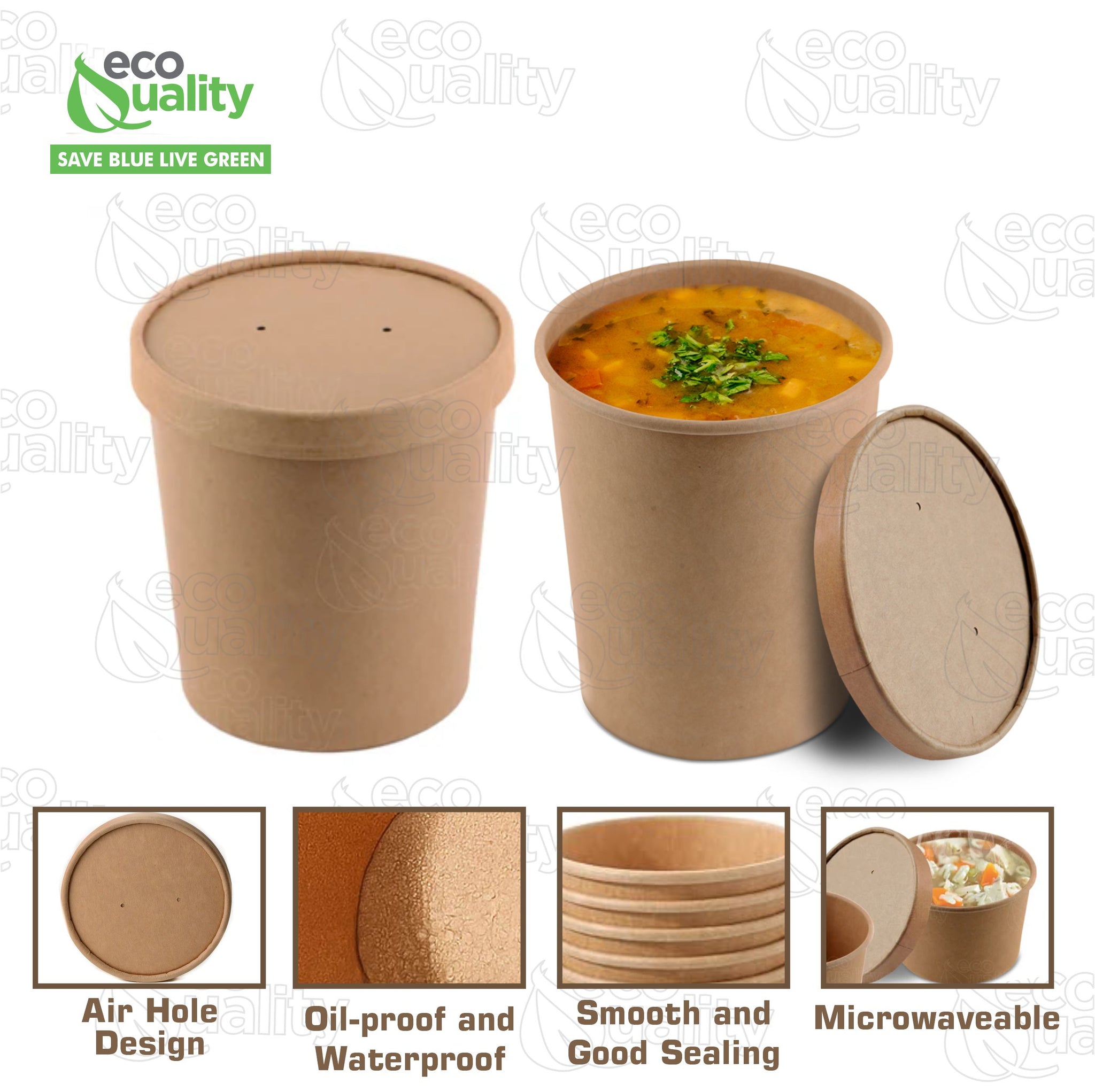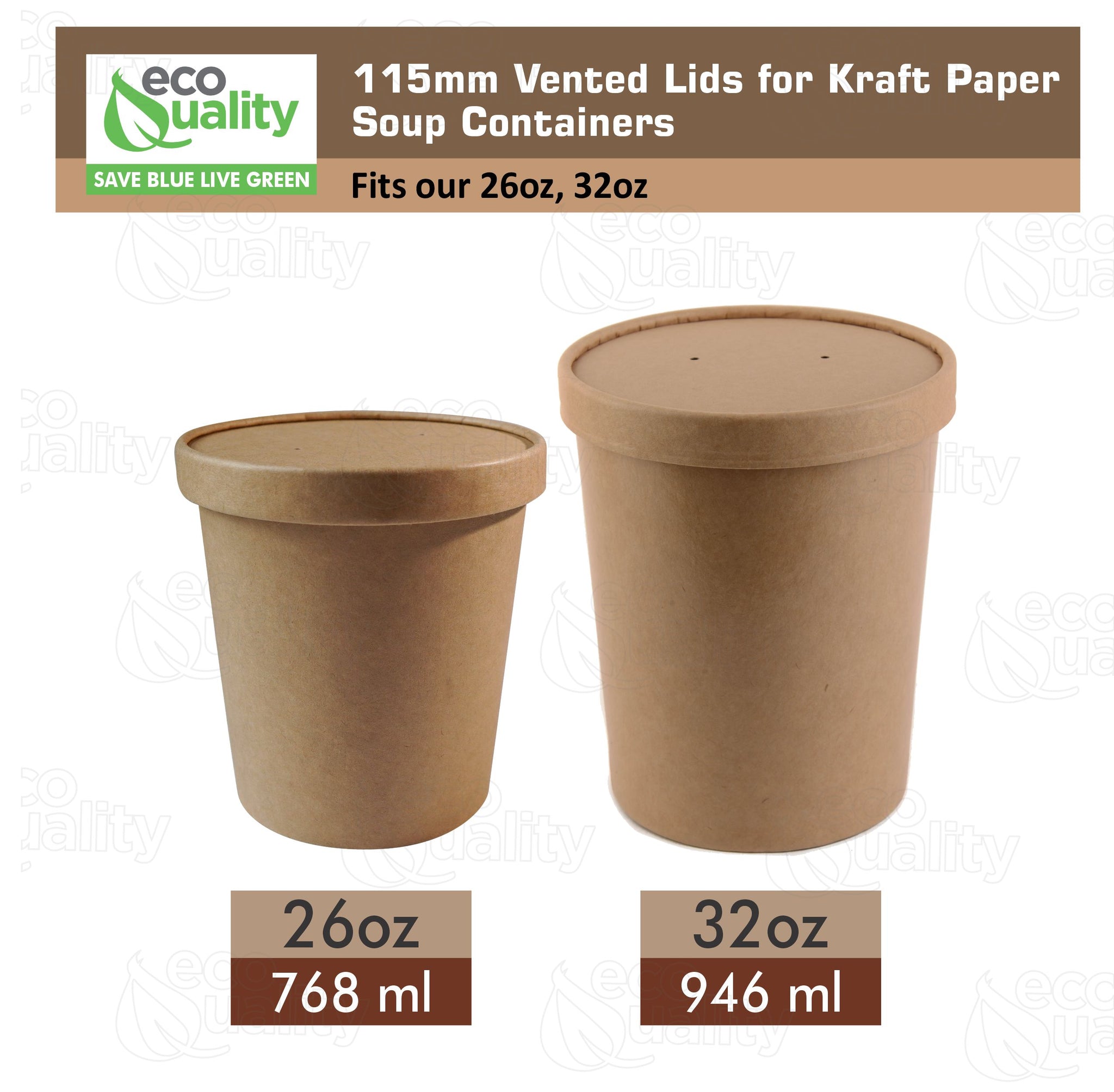 INCLUDES: 115mm Vented Lids for EcoQuality 26oz & 32oz Paper Soup Containers insure closure as well as prevent sogginess