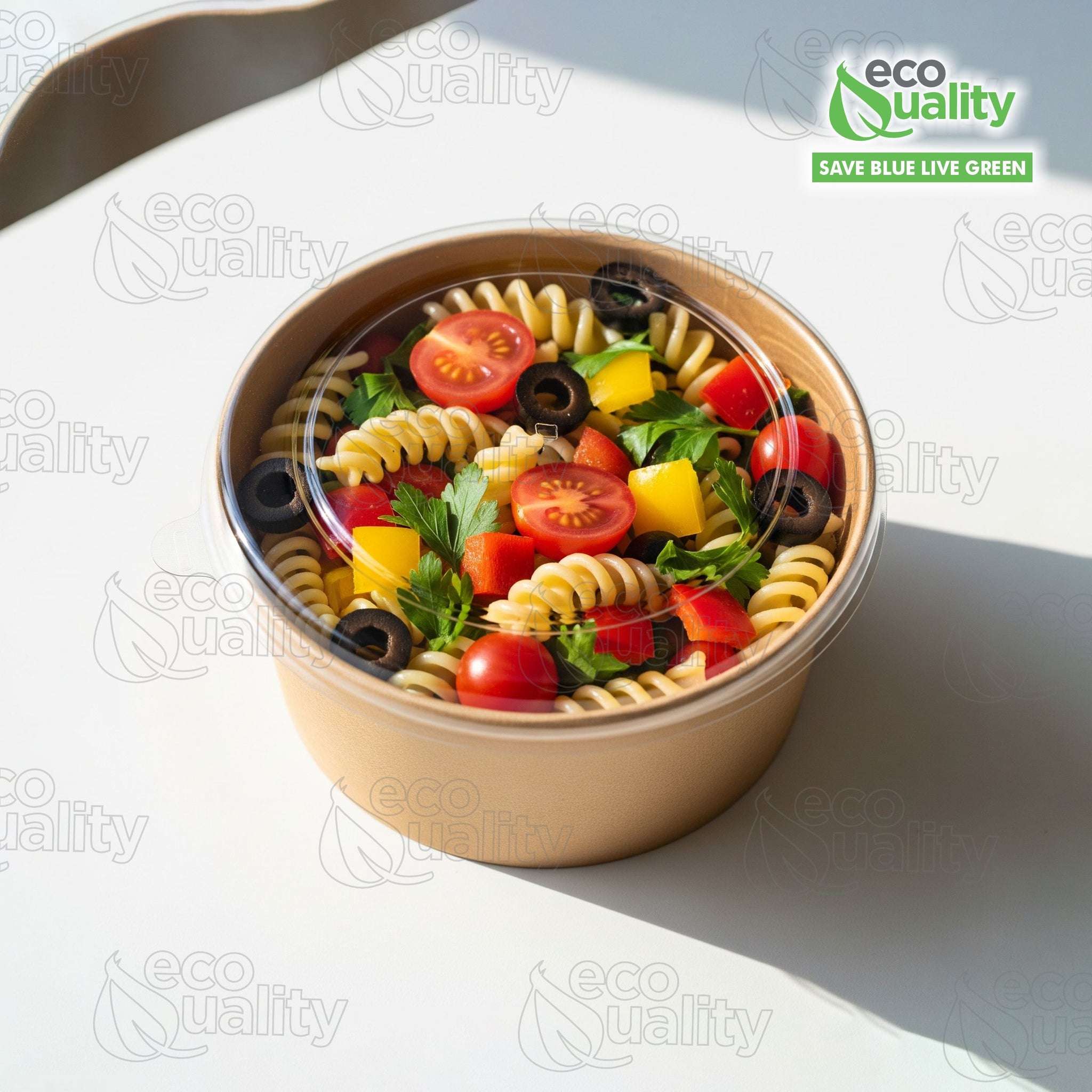 The EcoQuality 16oz round kraft paper bowl with 150mm clear PET lid offers an eco-friendly, durable solution for serving and transporting food. Perfect for snacks, salads, soups, meal prep, catering, and takeout, these bowls keep food fresh and visible. Made from biodegradable kraft paper paired with a secure clear lid, they’re ideal for restaurants, food trucks, and events looking to combine style with sustainability.